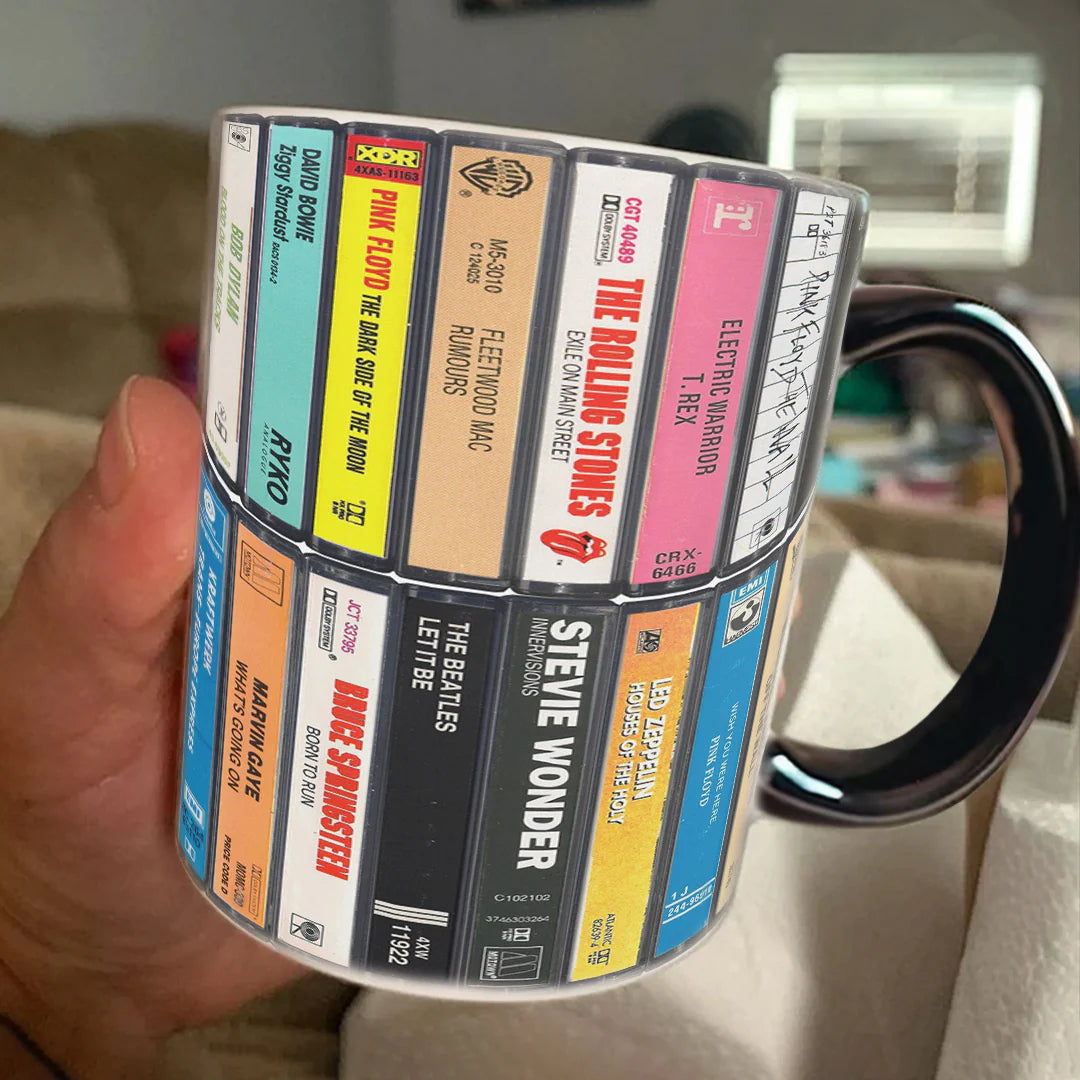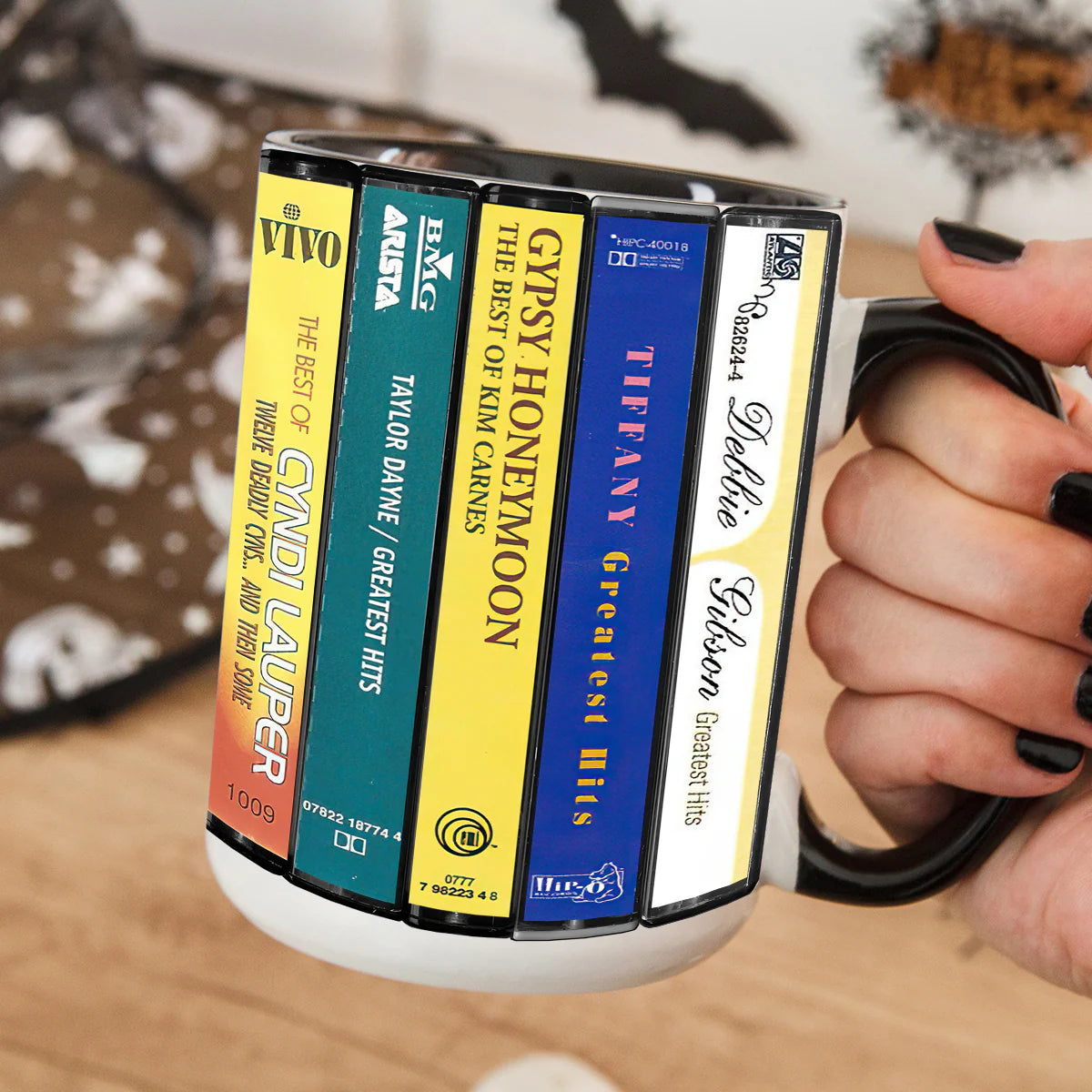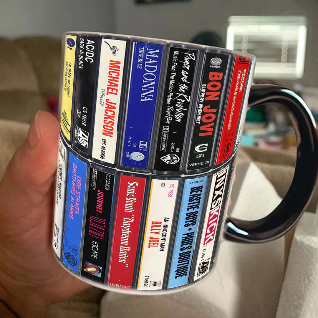 Relive the ’80s with this retro cassette accent mug, featuring a vibrant edge-to-edge print of iconic album covers. A durable, eye-catching piece perfect for music lovers.